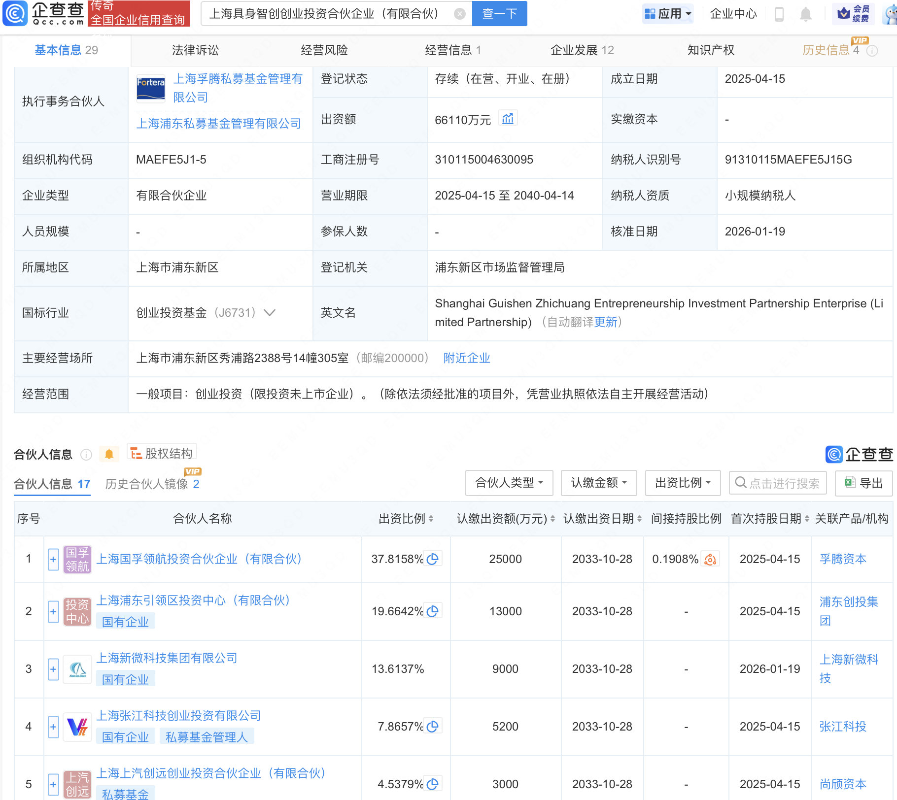 近日,上海具身智创创业投资合伙企业(有限合伙)发生工商变更,新增芯联集成(688469)全资子公司芯联股权投资(杭州)有限公司等为合伙人。企查查信息显示,该企业成立于2025年4月,出资额6.61亿元,经营范围包含:创业投资(限投资未上市企业),现由上海张江科技创业投资有限公司、上海上汽创远创业投资合伙企业(有限合伙)等及上述新增合伙人共同持股。