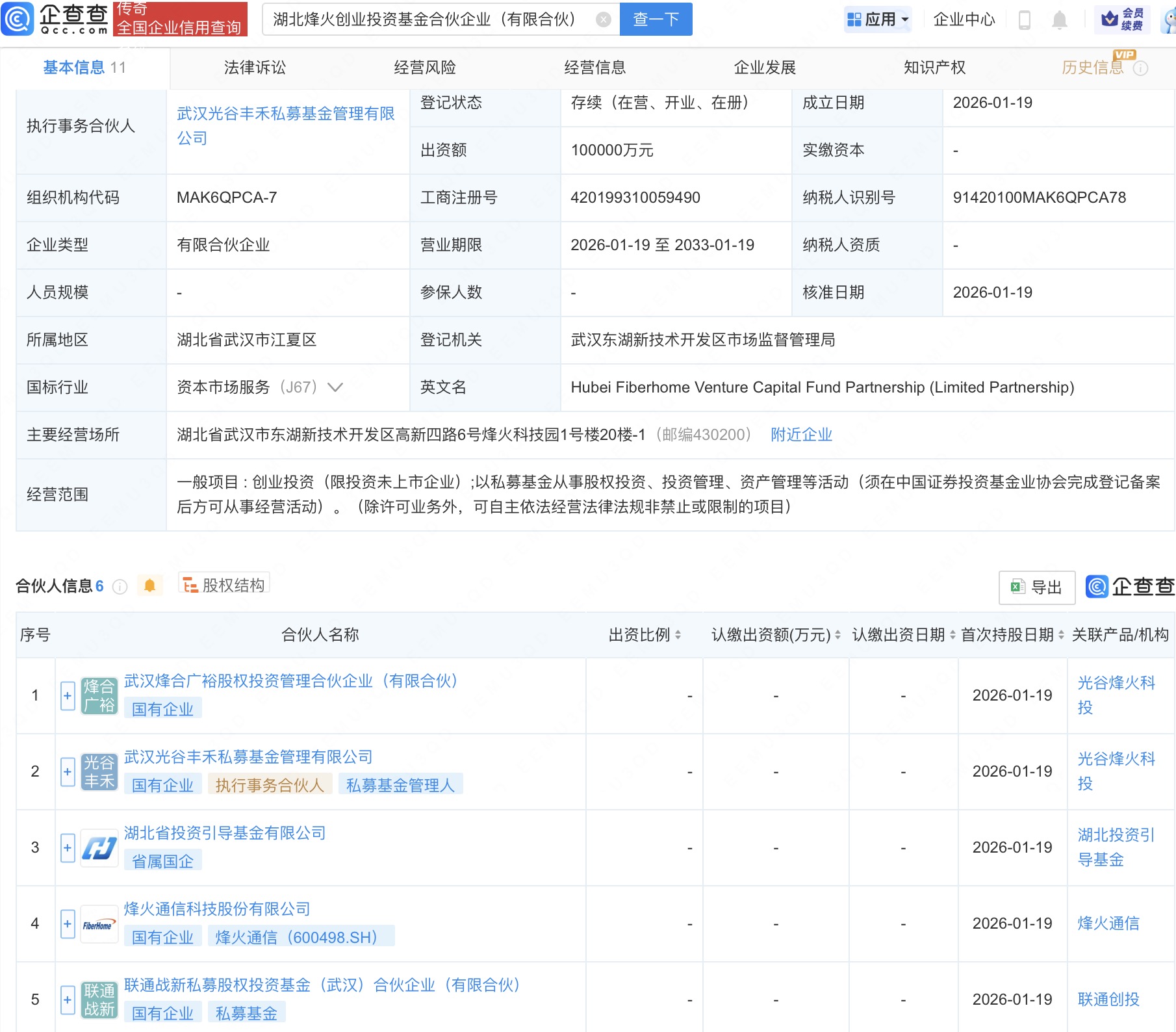 近日,湖北烽火创业投资基金合伙企业(有限合伙)成立,出资额10亿元,经营范围包含:创业投资(限投资未上市企业);以私募基金从事股权投资、投资管理、资产管理等活动。企查查股权穿透显示,该企业由烽火通信(600498)、联通战新私募股权投资基金(武汉)合伙企业(有限合伙)等共同出资。